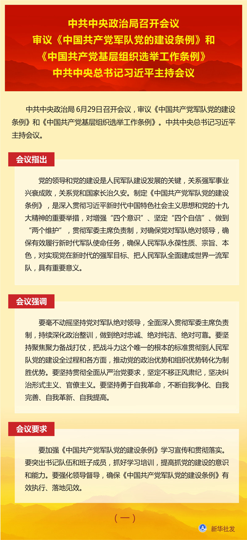 中共中央政治局召开会议 审议《中国共产党军队党的建设条例》和《中国共产党基层组织选举工作条例》 中共中央总书记习近平主持会议 新华社北京6月29日电 中共中央政治局6月29日召开会议 香蕉影视在线,审议《中国共产党军队党的建设条例》和《中国共产党基层组织选举工作条例》,中共中央总书记习近平主持会议。 会议指出,党的领导和党的建设是人民军队建设发展的关键,关系强军事业兴衰成败,关系党和国家长治久安,制定《中国共产党军队党的建设条例》,是深入贯彻习近平新时代中国特色社会主义思想和党的十九大精神的重要举措,对增强“四个意识”,坚定“四个自信”,做到“两个维护”,贯彻军委主席负责制,对确保党对军队绝对领导,确保有效履行新时代军队使命任务,确保人民军队永葆性质,宗旨,本色 香蕉影视高清,对实现党在新时代的强军目标,把人民军队全面建成世界一流军队,具有重要意义。 会议强调,要毫不动摇坚持党对军队绝对领导,全面深入贯彻军委主席负责制,持续深化政治整训,做到绝对忠诚,绝对纯洁,绝对可靠,要坚持聚焦聚力备战打仗,把战斗力这个唯一的根本的标准贯彻到人民军队党的建设全过程和各方面,推动党的政治优势和组织优势转化为制胜优势,要坚持贯彻全面从严治党要求,坚定不移正风肃纪,坚决纠治形式主义,官僚主义,要坚持勇于自我革命,不断自我净化 香蕉影视免费观看,自我完善,自我革新,自我提高。 会议要求,要加强《中国共产党军队党的建设条例》学习宣传和贯彻落实,要突出书记队伍和班子成员,抓好学习培训,提高抓党的建设的意识和能力,要强化领导督导 免费电影,确保《中国共产党军队党的建设条例》有效执行,落地见效。 会议指出,党的十八大以来,以习近平同志为核心的党中央高度重视基层党组织选举工作,对坚持和加强党的全面领导,贯彻执行民主集中制 香蕉在线,规范完善党内选举制度作出一系列重大部署,有力推动了基层党组织建设,制定和实施《中国共产党基层组织选举工作条例》,是落实党要管党,全面从严治党要求,是发扬党内民主,尊重党员民主权利,规范基层党组织选举的具体举措,对增强基层党组织政治功能和组织力,把基层党组织建设成为宣传党的主张,贯彻党的决定,领导基层治理,团结动员群众,推动改革发展的坚强战斗堡垒,巩固党长期执政的组织基础,具有重要意义。 会议强调,要严格执行选举制度规定,提高党内选举质量,保障党章赋予的党员权利,增强党的意识,政治意识,规矩意识,要严格代表资格条件,确保选出合格的代表 香蕉影视,要合理分配代表名额,优化代表结构,确保生产和工作一线代表比例,要按照德才兼备,以德为先和班子结构合理的原则提名委员候选人,要坚持教育在先,警示在先,预防在先,严肃政治纪律,组织纪律和换届纪律,确保选举风清气正。 会议要求,各级党委要加强对《中国共产党基层组织选举工作条例》实施的组织领导,严格落实党委主体责任,加强谋划,精心组织,全程把关 香蕉影视在线,要贯彻执行民主集中制,教育引导党员和代表正确行使民主权利,保证选举工作平稳有序,要强化基层党组织书记和党务骨干培训,提升工作规范化水平,要加强督促落实,确保《中国共产党基层组织选举工作条例》各项规定要求落到实处。 会议还研究了其他事项。 | ||