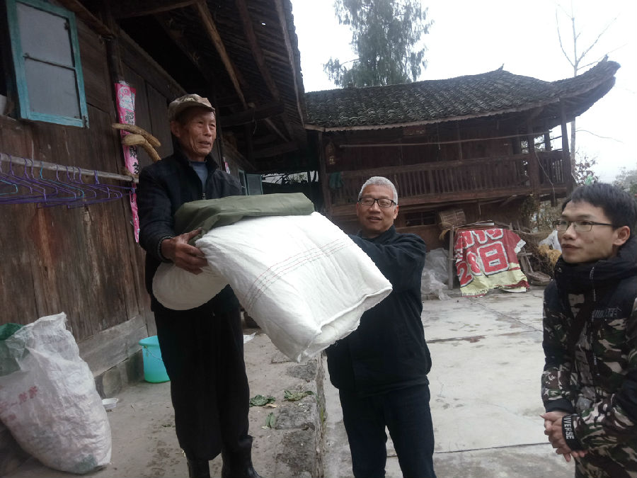 朱利庆为搬迁新家的建档立卡贫困户送上新被子和祝福