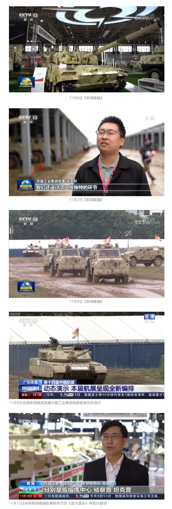 11月6日,7日,9日 香蕉影视在线,央视《新闻联播》三次报道兵器工业集团参展情况,重点介绍了集团公司总体参展情况,地面装备动态演示全新编排,国产轮式反伏击车首次采用有人驾驶和无人驾驶混合编队等内容,11月8日,央视新闻频道直播地面装备动态演示,11月12日,央视新闻频道航展特别报道《蓝天盛会》探访兵器馆,采访兵器工业集团嘉宾对陆军合成旅作了报道。