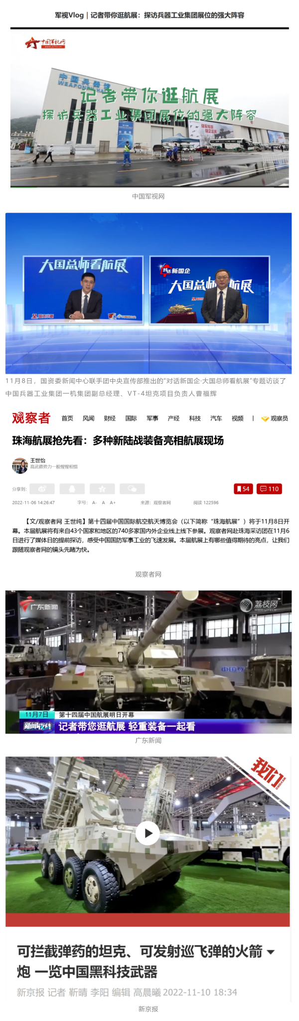 此次航展,央视新闻频道《朝闻天下》《新闻直播间》《东方时空》《共同关注》《新闻30分》《24小时》,央视国防军事频道《国防军事早报》《军事报道》《军迷行天下》,央视国际频道《中国新闻》《今日环球》等栏目共播出兵器工业集团参展相关新闻报道30余条 免费电影。