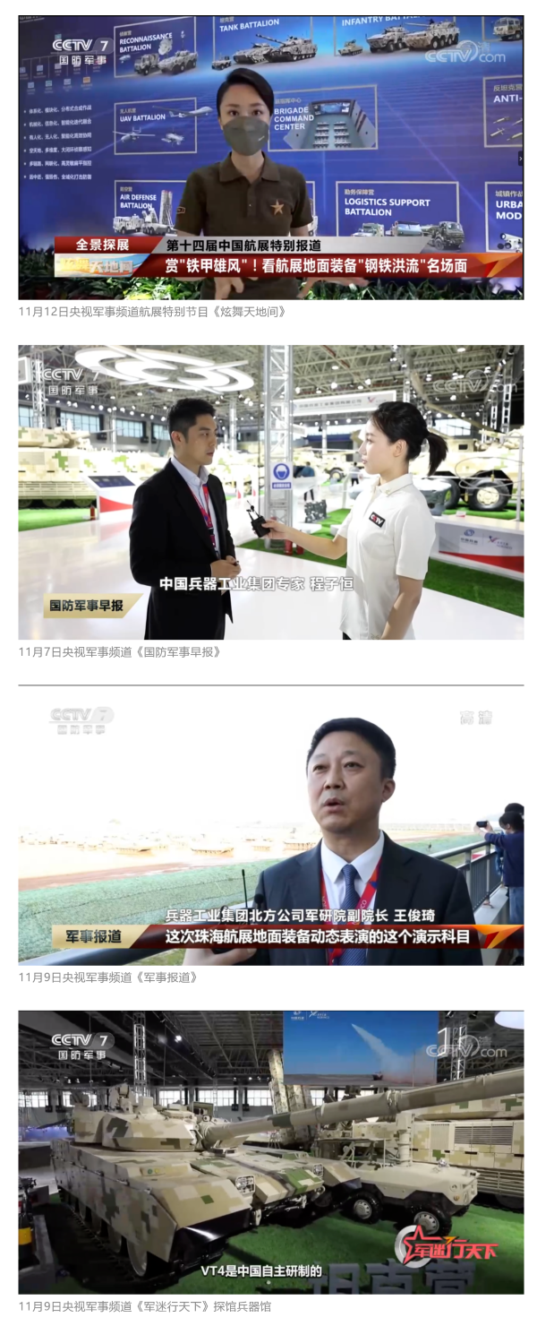 央视国防军事频道航展特别报道《炫舞天地间》11月12日《赏“铁甲雄风”,看航展地面装备“钢铁洪流”名场面》对兵器工业集团武器装备特色亮点进行报道,《国防军事早报》11月7日推出报道《第十四届中国国际航空航天博览会明天开幕 中国兵器馆首次以陆军合成旅实战体系形式展出》 香蕉影视免费观看,对兵器馆陆军合成旅实战体系进行报道,《军事报道》11月9日推出《第十四届中国国际航空航天博览会 地面兵器装备首次联合陆航直升机进行动态展示》报道,《军迷行天下》11月9日推出报道《军迷打卡航展2022》以专业军迷视角探馆兵器馆,全面展示兵器工业集团参展装备特色亮点。