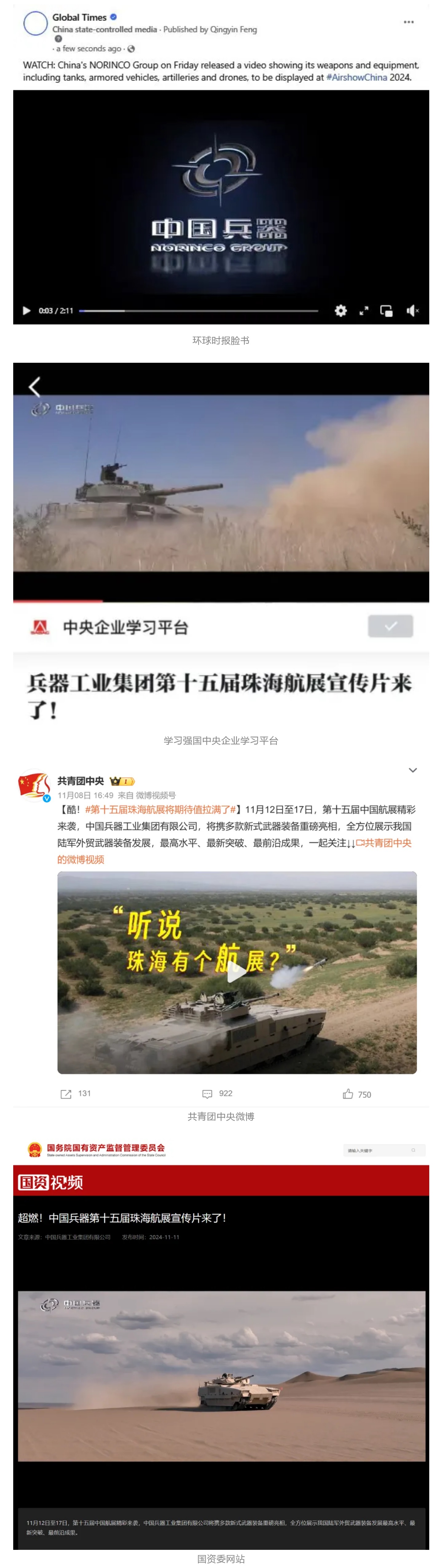 人民日报微博,新华社客户端,央视军事微博 香蕉影视高清,中国军号微博,央视军事报道微博,中国日报微博,中国新闻网,中国青年报-青蜂侠,环球网,环球时报(脸书,X平台),学习强国中央企业学习平台,共青团中央微博,国资委网站等20余家中央主流媒体,国家部委的新媒体第一时间播发集团公司航展宣传片等视频作品燃爆全网,累计阅读量突破1200万人次,集团公司微信公众号,微博,抖音号,快手号,微信视频号,知乎号等新媒体宣传片播放阅读量近1000万人次,点赞近20万人次。