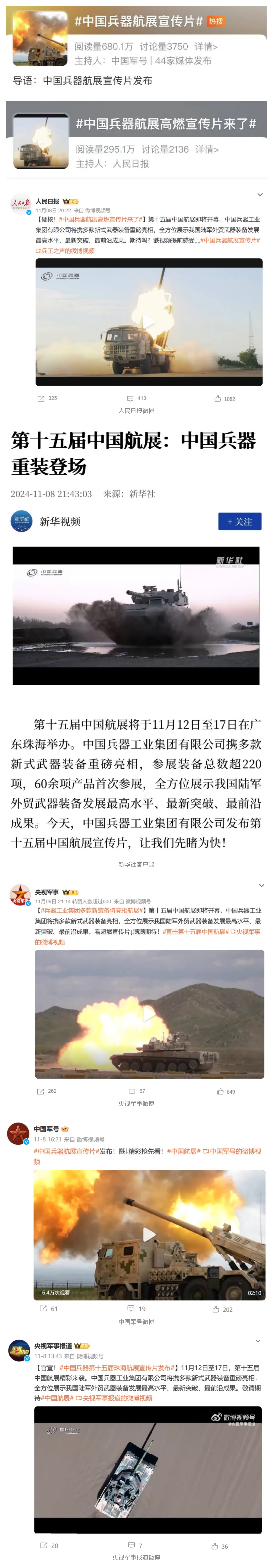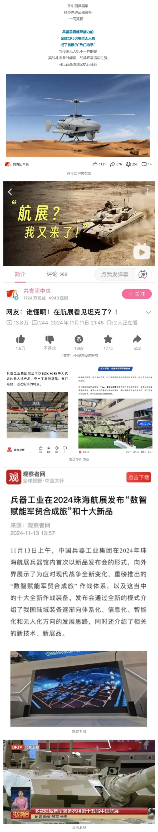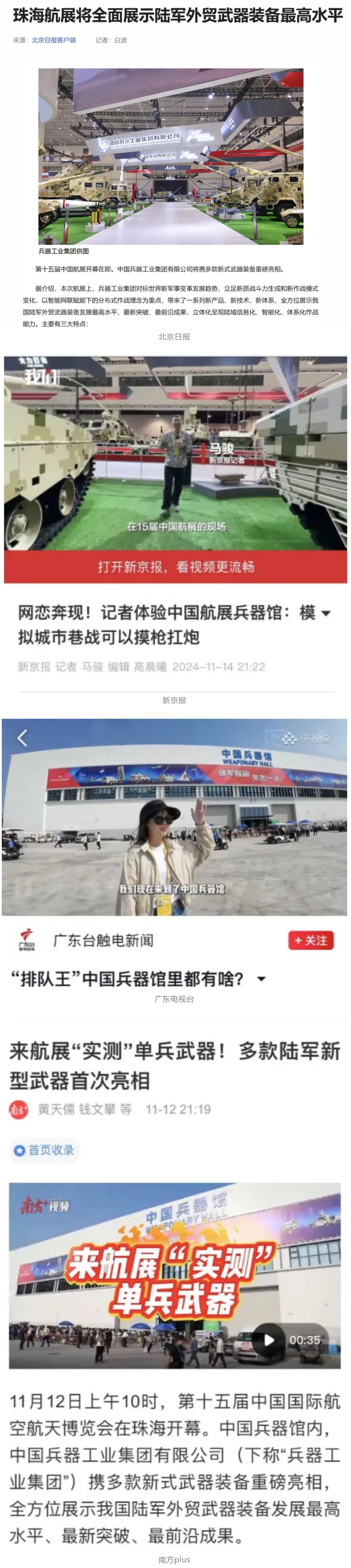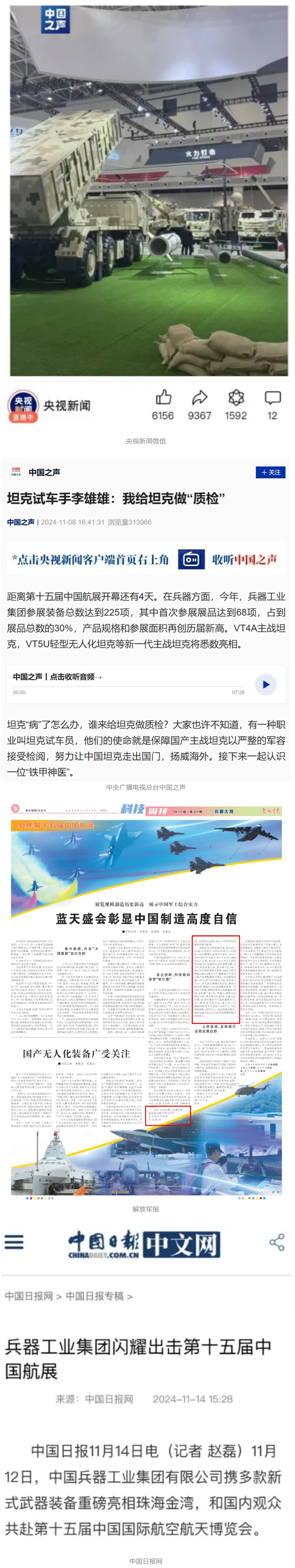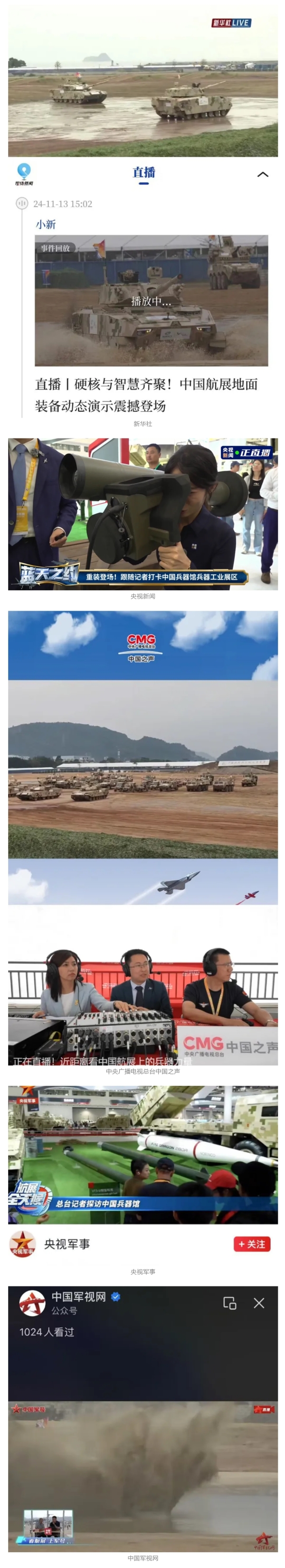 11月13日央视新闻《蓝天之约》直播地面装备动态演示此次航展,央视综合频道《新闻联播》《晚间新闻》,新闻频道《新闻直播间》《新闻30分》《朝闻天下》《共同关注》《东方时空》《午夜新闻》,财经频道《天下财经》《经济信息联播》《正点财经》《第一时间》,中文国际频道《今日环球》《中国新闻》,国防军事频道《军事报道》《正午国防军事》《国防军事早报》《军迷行天下》等栏目共播出兵器工业集团参展相关新闻报道40余条 香蕉影视在线,11月10日央视新闻频道《新闻30分》11月10日央视中文国际频道《中国新闻》11月10日央视国防军事频道《军事报道》11月11日央视国防军事频道《正午国防军事》。