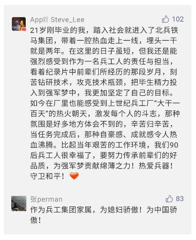 在中国共产党成立九十九周年之际 香蕉影视,由中国兵器工业集团有限公司组织摄制,反映人民兵工在党的领导下80余年光辉奋斗历程,广大兵工人弘扬“把一切献给党”人民兵工精神的三集纪录片《人民兵工》自7月1日-3日每晚20点在中央广播电视总台中文国际频道(CCTV-4)《国家记忆》首播以来,在兵器系统和观众中引发强烈反响,很多网友,观众纷纷留言表达了自己的观后感受。 观众在兵器工业集团官微的留言区直抒了观影感受,有的热泪盈眶,有的心潮起伏 香蕉影视在线,有的兴起赋诗,有的认为让心灵得到净化,思想得以提升,有的认为是最直观的国防教育教材....... 影片勾起了退休老同志无限怀念 香蕉影视高清. 兵工人的甜美记忆. 摄制期间官田中央兵工厂文化教育基地工作人员的难忘瞬间....... 相比老一辈,年a轻的兵工人也表达了传承红色基因,弘扬新时代“把一切献给党”的人民兵工精神的豪迈气概...... 香蕉影视免费观看. 其中也不乏在校的学生 免费电影,在感谢英模树立的榜样和丰碑的同时,也为自己的职业生涯定好坐标,做好规划,努力前行....... 作为新时代弘扬人民兵工精神的特色文化成果,纪录片的播出,凝聚起广大兵器干部职工团结奋斗新时代磅礴力量 香蕉在线,极大的增强了兵工人的自豪感,大家纷纷表达了作为军工央企一员 “此生无悔入军工”的使命担当....... 《人民兵工》共分为三集,分别是《摇篮》《锤炼》《前行》,全景式展示了我们党领导和创建的第一个军事工业部门——人民兵工80余年来从无到有,从小到大,从弱到强的光辉奋斗历程,生动讲述了广大兵工人听党话,跟党走,大力弘扬“把一切献给党”的人民兵工精神,自力更生,艰苦奋斗 香蕉影视,开拓进取,无私奉献的家国情怀和感人事迹,在人民兵工80余年筚路蓝缕的奋斗历程中,涌现出吴运铎,倪志福,祝榆生等一大批英模人物,在血与火的考验中凝练形成了“把一切献给党”的人民兵工精神,成为人民兵工奋斗不息的红色基因,(王珊)。 | ||