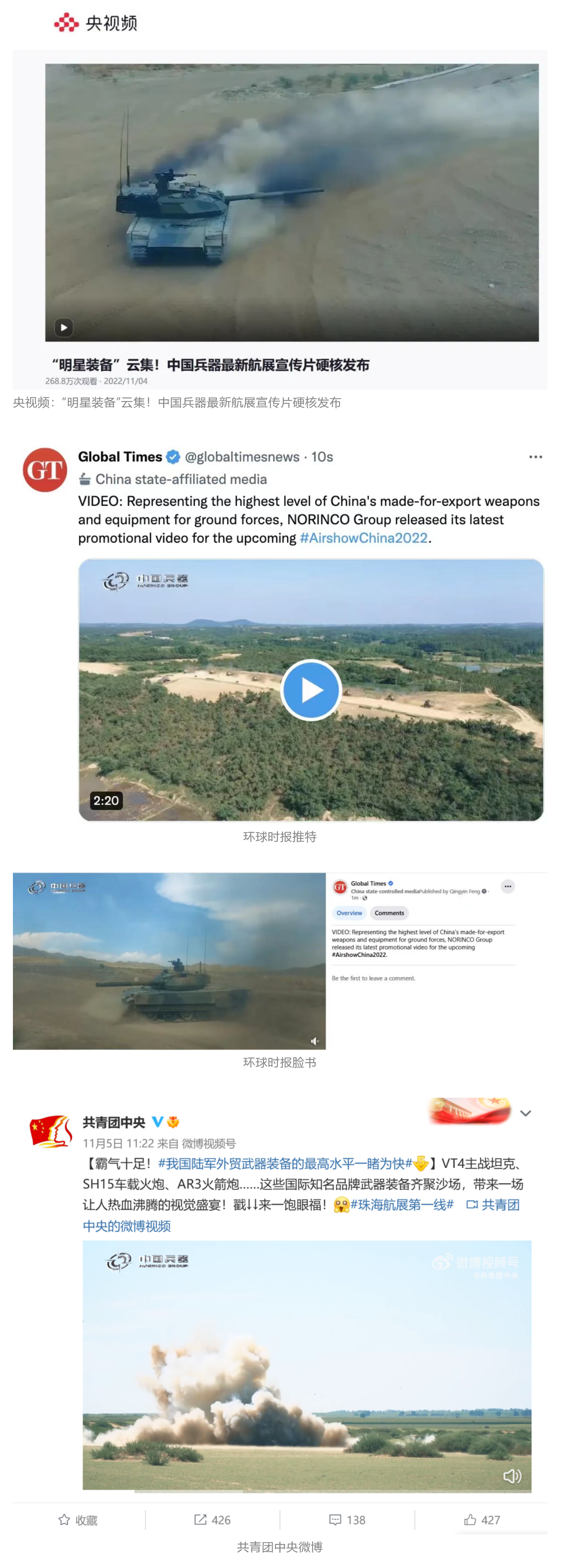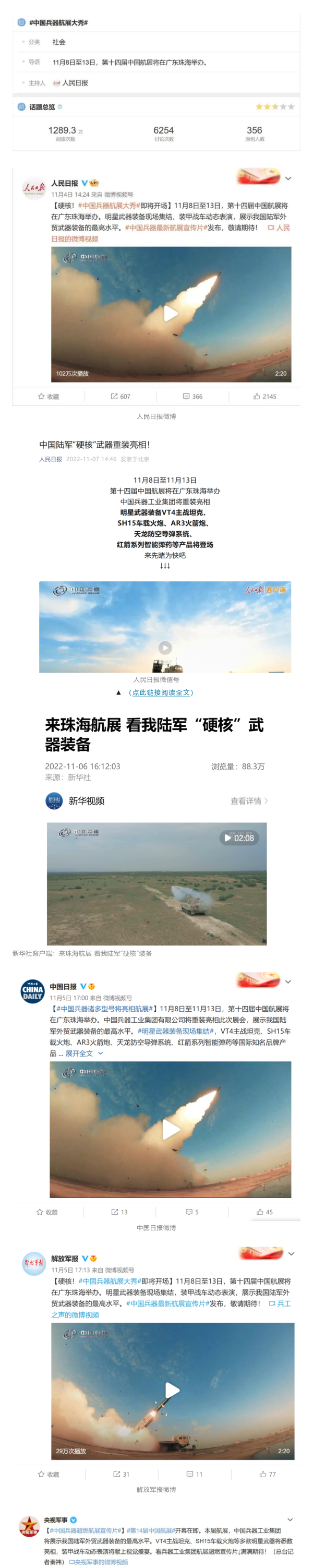人民日报官方微博,微信公众号,新华社客户端,央视新闻客户端,中国日报微博,参考消息微信公众号,解放军报微博,央视军事微博,CGTN微博,中国军号微博,共青团中央微博,环球时报(英文网站,脸书账号,推特账号),哔哩哔哩,学习强国平台,国资小新视频号,网易军事,腾讯军事,凤凰军事,北京日报,东方卫视看看新闻全媒体 香蕉在线,北京电视台等20余家中央主流媒体,国家部委,省市媒体的新媒体第一时间播发集团公司航展宣传片等视频作品燃爆全网,累计阅读量突破1700万人次,集团公司微信公众号,微博,抖音号,快手号,微信视频号,知乎号等新媒体宣传片播放阅读量超过800万人次,点赞超过30万人次,集团公司微信公众号推出《硬核,中国兵器最新航展宣传片发布》《中国兵器航展节目单,请选出心中明星装备》《航展首日,中国兵器闪耀亮相,》等7篇报道,阅读量超过25万人次,集团公司微信视频号,抖音号,快手号等新媒体账号发布“中国兵器航展大秀”系列视频,观看量超过330万人次。