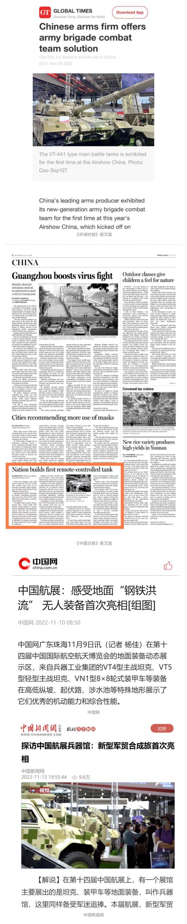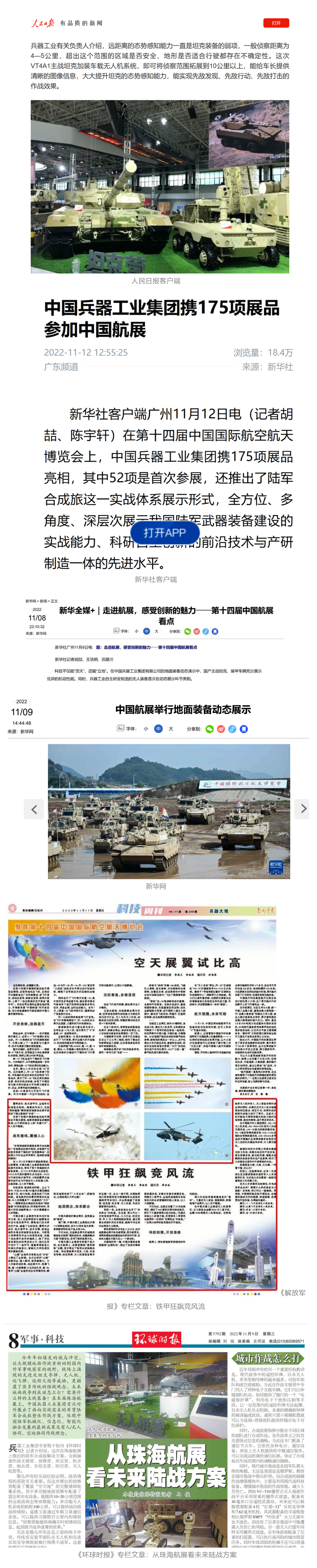央视国防军事频道航展特别报道《炫舞天地间》11月12日《赏“铁甲雄风”,看航展地面装备“钢铁洪流”名场面》对兵器工业集团武器装备特色亮点进行报道,《国防军事早报》11月7日推出报道《第十四届中国国际航空航天博览会明天开幕 中国兵器馆首次以陆军合成旅实战体系形式展出》 香蕉影视免费观看,对兵器馆陆军合成旅实战体系进行报道,《军事报道》11月9日推出《第十四届中国国际航空航天博览会 地面兵器装备首次联合陆航直升机进行动态展示》报道,《军迷行天下》11月9日推出报道《军迷打卡航展2022》以专业军迷视角探馆兵器馆,全面展示兵器工业集团参展装备特色亮点。
