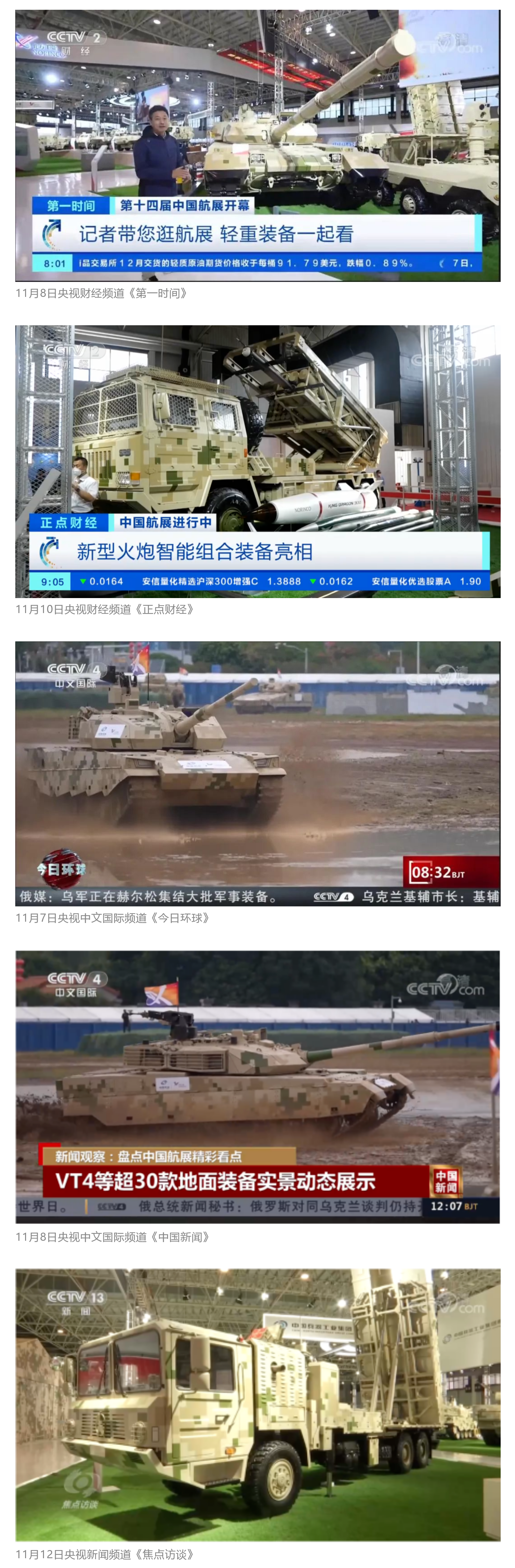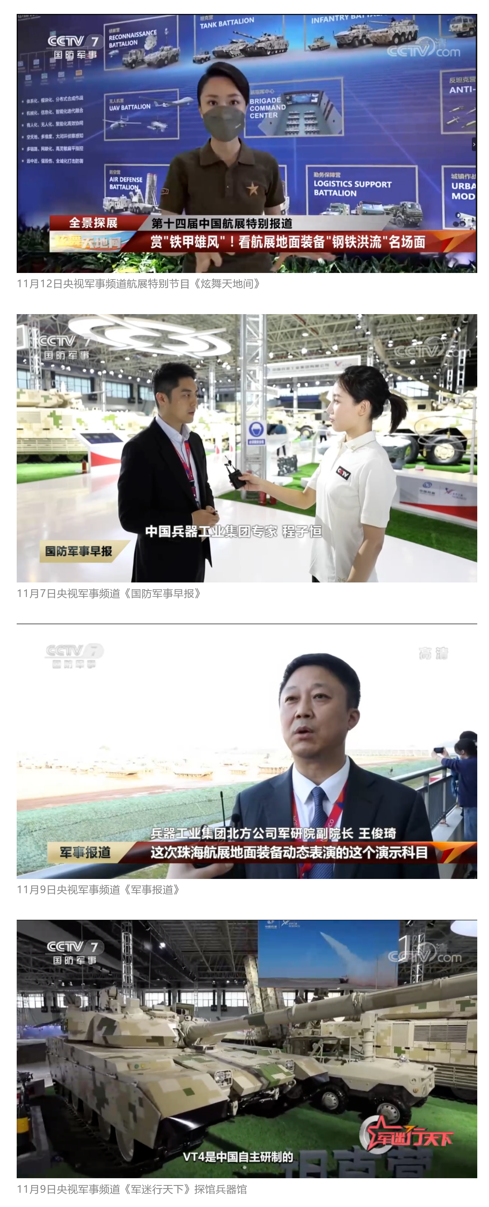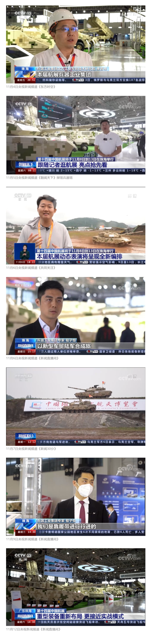 此次航展,央视新闻频道《朝闻天下》《新闻直播间》《东方时空》《共同关注》《新闻30分》《24小时》,央视国防军事频道《国防军事早报》《军事报道》《军迷行天下》,央视国际频道《中国新闻》《今日环球》等栏目共播出兵器工业集团参展相关新闻报道30余条 免费电影。