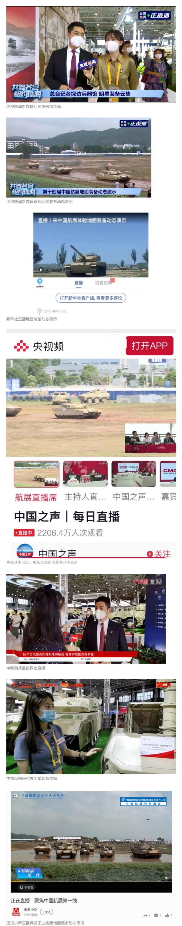 央视新闻新媒体,央视频中国之声,新华社,中国新闻网,中国军视网,CGTN(微博 香蕉影视,脸书,推特)等媒体以及国资小新,共青团中央,凤凰军事等到兵器工业集团地面动态演示区,中国兵器馆进行了直播,航展期间,集团公司微信视频号,微博,抖音号,快手号共进行8次直播,最高观看人数突破24万。