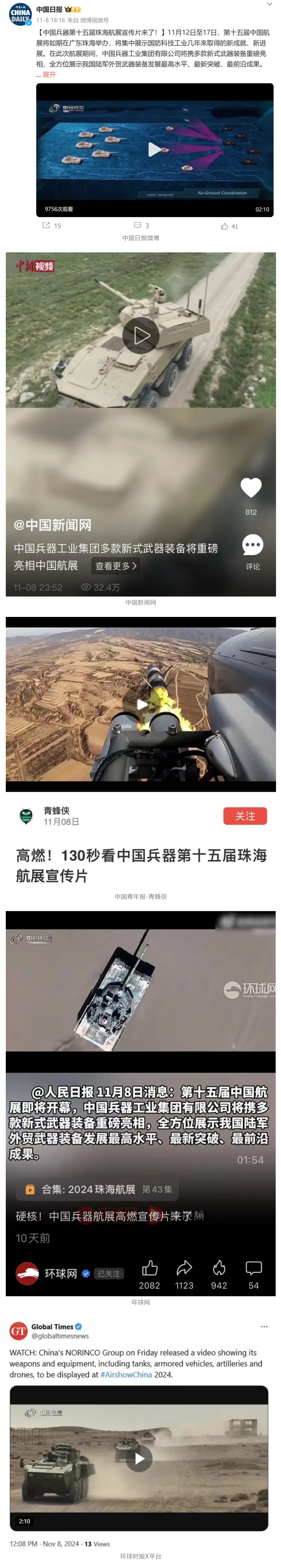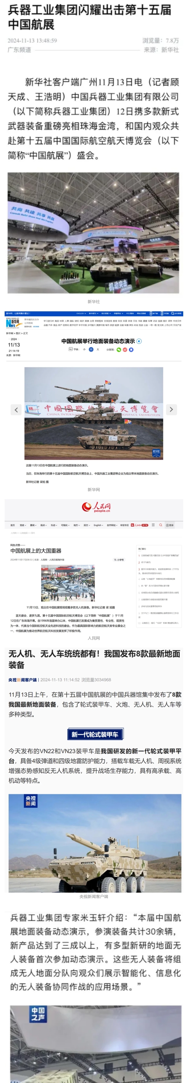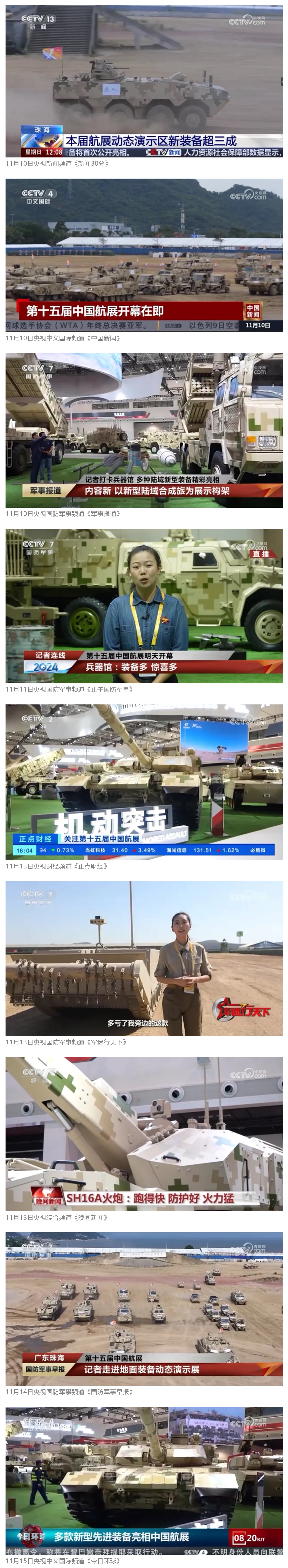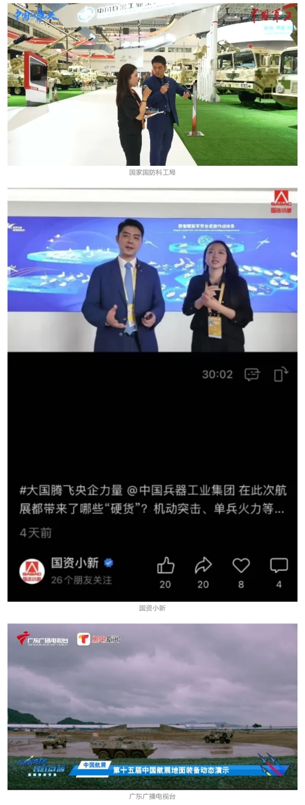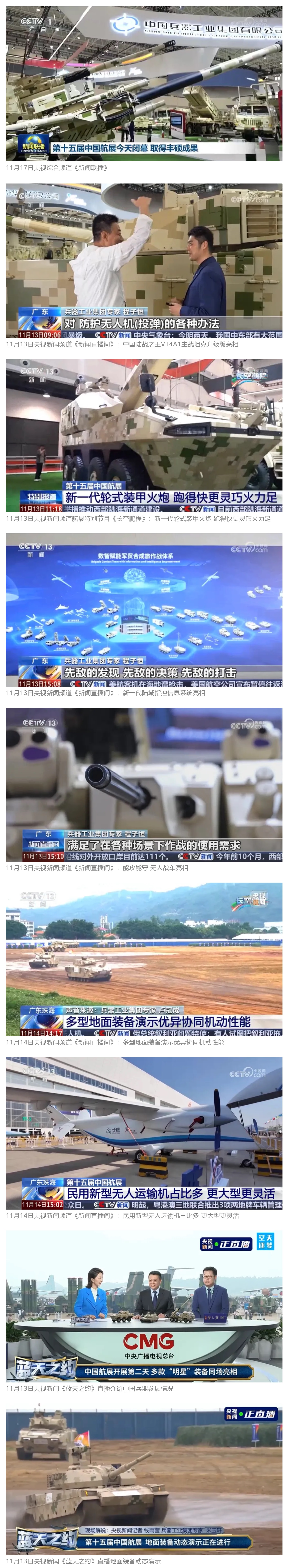 11月13日央视新闻《蓝天之约》直播地面装备动态演示此次航展,央视综合频道《新闻联播》《晚间新闻》,新闻频道《新闻直播间》《新闻30分》《朝闻天下》《共同关注》《东方时空》《午夜新闻》,财经频道《天下财经》《经济信息联播》《正点财经》《第一时间》,中文国际频道《今日环球》《中国新闻》,国防军事频道《军事报道》《正午国防军事》《国防军事早报》《军迷行天下》等栏目共播出兵器工业集团参展相关新闻报道40余条 香蕉影视在线,11月10日央视新闻频道《新闻30分》11月10日央视中文国际频道《中国新闻》11月10日央视国防军事频道《军事报道》11月11日央视国防军事频道《正午国防军事》。