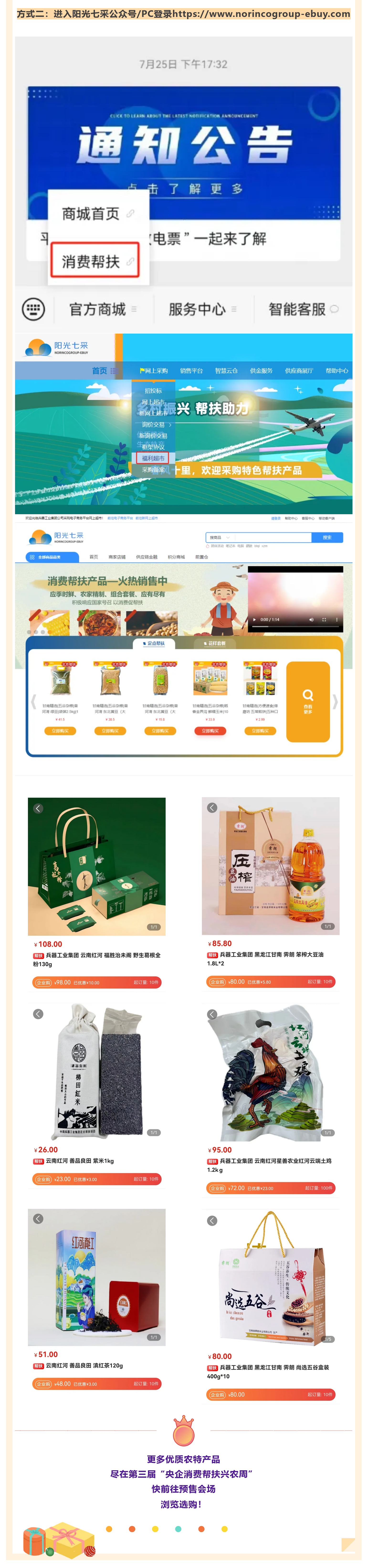 百家央企聚合力 消费帮扶促振兴 第三届“央企消费帮扶兴农周” 预售已启动 8月30日 兴农周活动将正式开启 “央企消费帮扶兴农周”由国务院国资委社会责任局指导,央企消费帮扶电商平台(国网数字科技控股有限公司)主办,国务院国资委机关服务管理局、国务院国资委香蕉影视高清、国网北京市电力公司、各中央企业电商平台联合协办。 活动以“央企携手,兴农惠民”为主题,组织动员中央企业所属各单位各部门(特别是工会,食堂),广大干部职工 香蕉影视在线,上下游供应商和业务合作伙伴采购帮扶县的优质农产品,促进脱贫地区产业发展和脱贫群众稳定增收,巩固拓展脱贫攻坚成果。 预售活动火热开启 为方便大家提前选购 此次预售期升级为10天 (8月20日-8月29日) 诚邀下单 兵器工业集团定点帮扶 黑龙江甘南县、云南红河县 农特产品! 8月30日-9月5日 请锁定“央企馆-兵器工业集团” 我们一起共谱乡村振兴新篇章! | ||