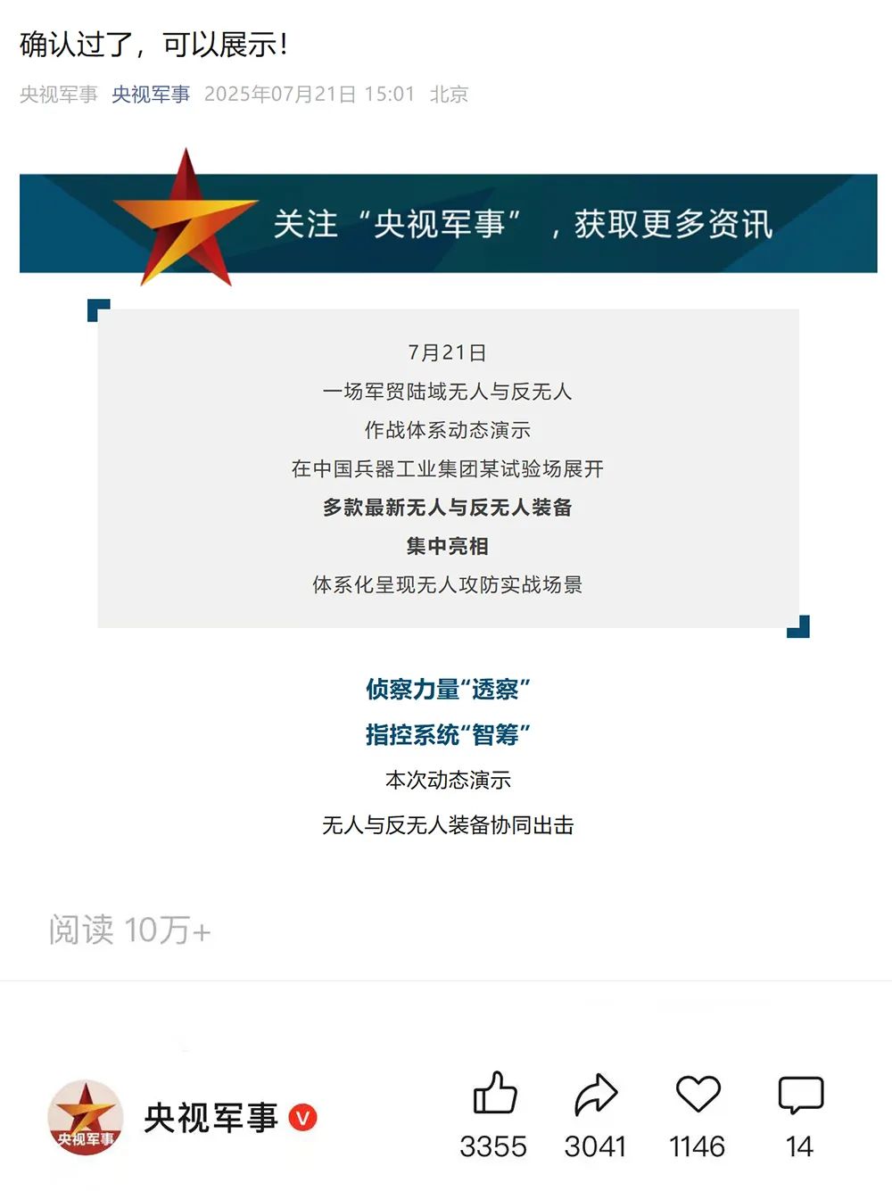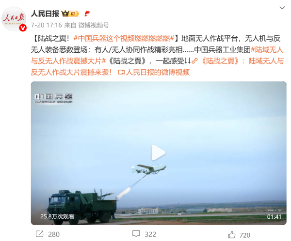 7月21日,中国兵器工业集团有限公司在位于内蒙古的某试验场举办军贸陆域无人与反无人作战体系主题日活动 香蕉影视,携无人机,巡飞弹,反无人机等最新武器装备登场亮相,展现了一场无人与反无人领域激烈对抗的实战场景,中央主流媒体,地方媒体,知名网络媒体,以及集团公司各宣传平台纷纷进行报道,多次登上热搜,引发广泛关注。 央视新闻频道《新闻直播间》《东方时空》《24小时》,国防军事频道《正午国防军事》《军事报道》《国防军事早报》,中文国际频道《今日环球》 香蕉影视在线,央视军事新媒体等报道了集团公司军贸陆域无人与反无人作战体系首次公开实装动态演示有关情况,重点介绍了无人与反无人作战最新装备。 央视新闻频道《新闻直播间》:内蒙古 军贸陆域无人与反无人作战最新装备亮相 央视新闻频道《新闻直播间》:内蒙古 军贸陆域无人与反无人作战最新装备亮相 记者探访无人装备展区 央视新闻频道《新闻直播间》:军贸陆域无人与反无人作战最新装备亮相·记者探访 最强“盾牌” 反无人机系统新升级 人民日报微博,央视军事微博,央视新闻客户端,中国新闻网,中新社国是直通车抖音,环球网微博,环球时报(X平台,英文版客户端),中国日报网,央视军事报道微博,中国军号微博,中央广播电视总台“空天逐梦”微信视频号,共青团中央B站,国资小新微博等中央主流媒体 香蕉在线,国家部委的新媒体播发集团公司陆域无人与反无人作战大片等视频作品。 人民日报微博 央视军事微博 人民日报,新华网,央视军事,央视新闻,中央广播电视总台中国之声,中国新闻网,中国日报网,中国日报英文报刊《CHINA DAILY》,《科技日报》,光明日报客户端,环球网,环球时报,人民日报海外版-海外网,央视网,小央视频,参考消息,瞭望东方周刊,共青团中央 香蕉影视,国资小新新媒体,新浪网,腾讯网,搜狐网,凤凰网,网易网等中央主流媒体,国家部委的新媒体及知名网络媒体对集团公司军贸陆域无人与反无人作战体系主题日活动进行了图文,音频,视频报道。 央视军事微信 人民日报微信 新华网微信 来源/各主流媒体 | ||